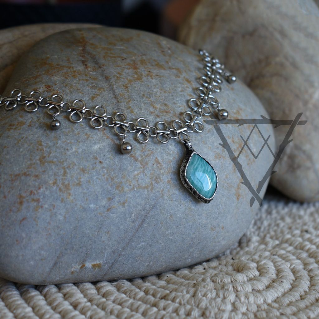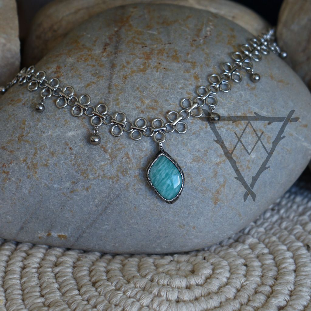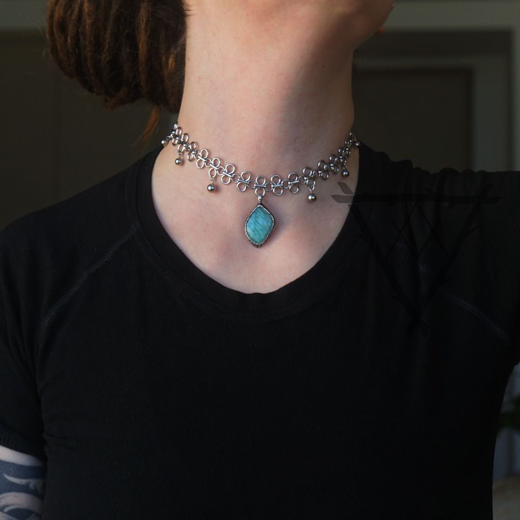 Choker s Amazonitem, zdobeným řetězem z oceli a ocelovými kuličkami.