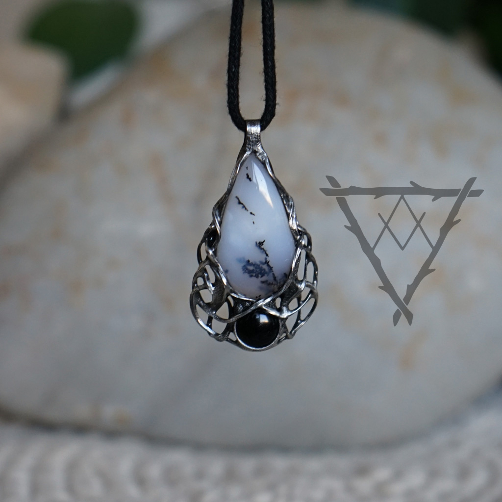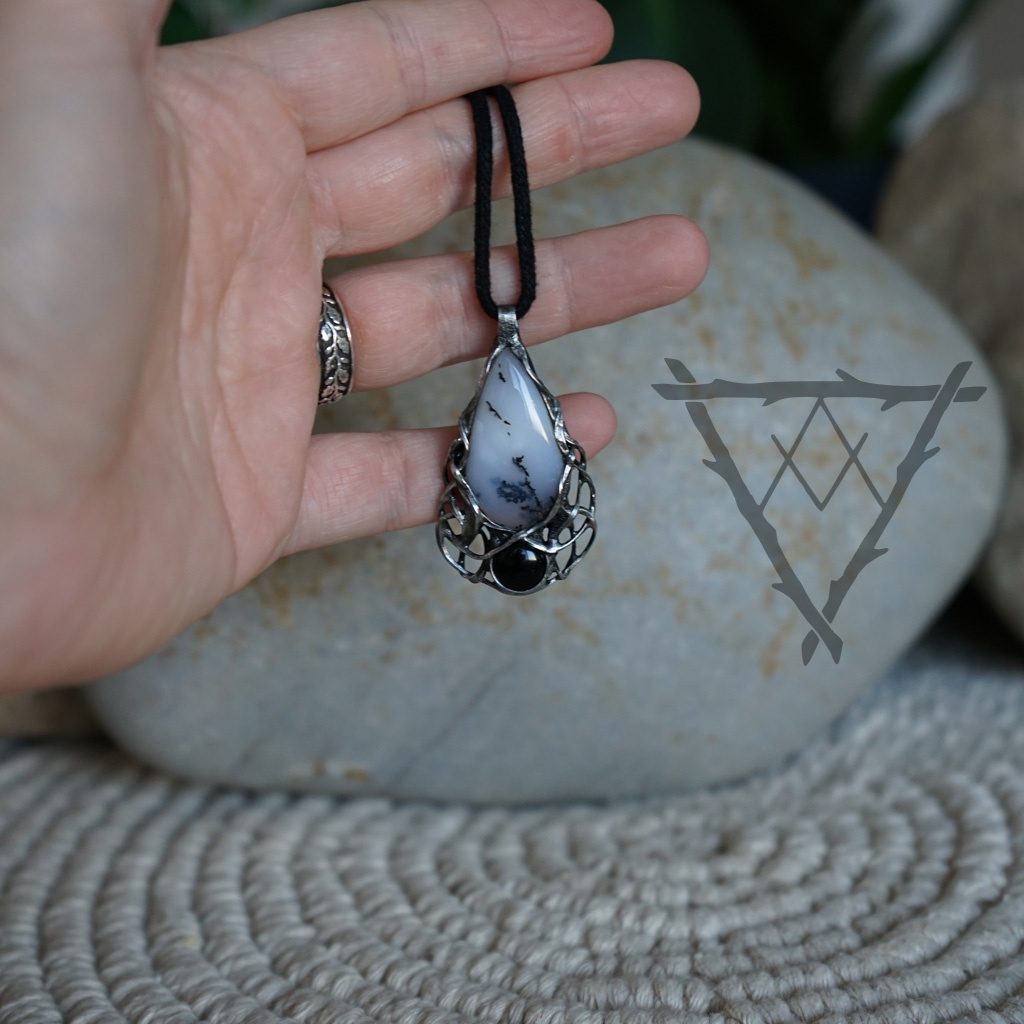 Šperk spojuje energii dvou silných kamenů – Merlinitu a Onyxu, které společně vytvářejí harmonii světla a stínu. Merlinit, známý jako kámen moudrosti a duchovního vhledu, podporuje intuici, porozumění skrytým souvislostem a jemnější vnímání energie. Je spojován se starou magií, schopností vidět za povrch věcí a s klidným vnitřním vedením.
