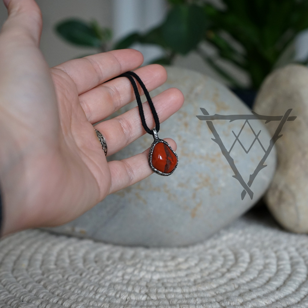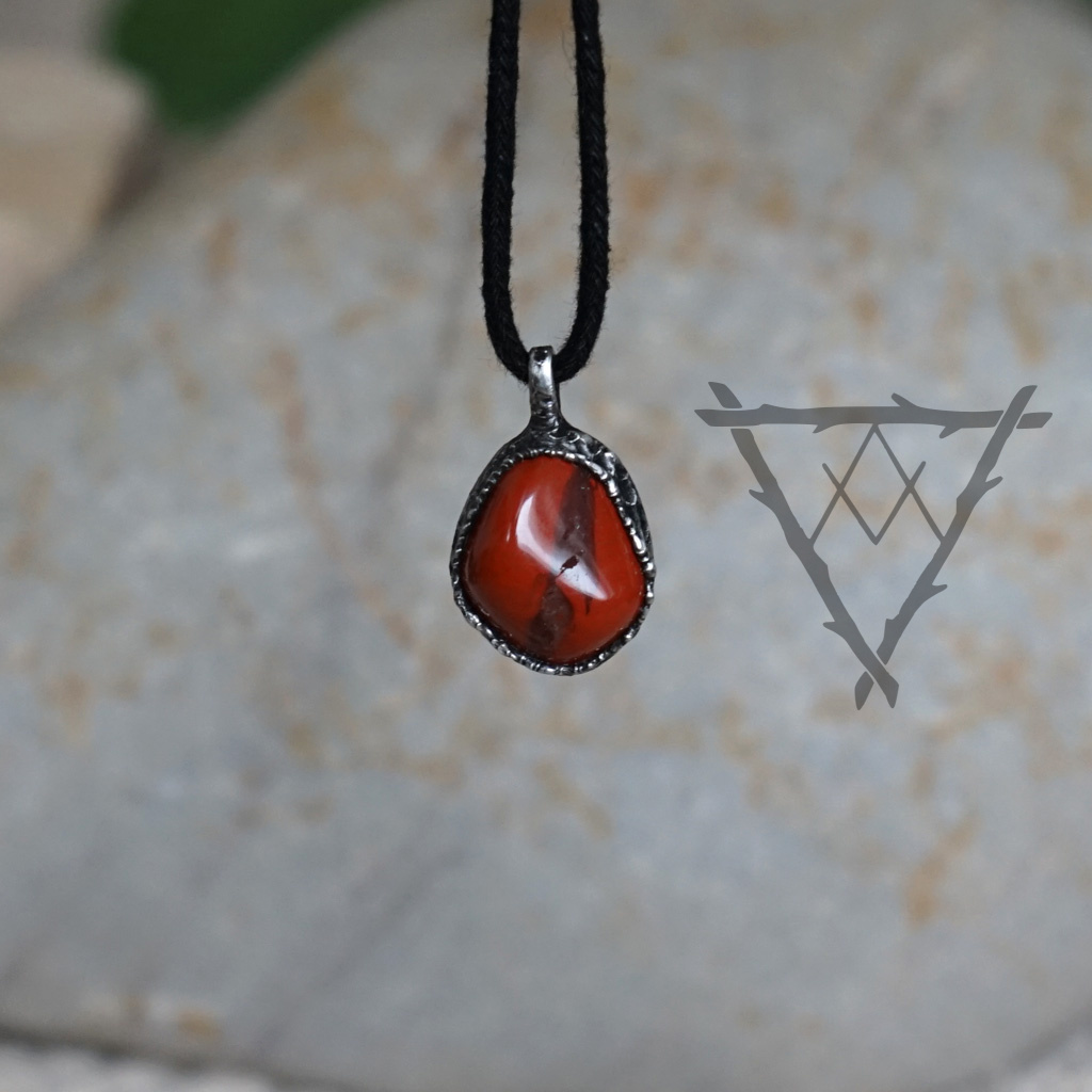 Jaspis červený je neprůhledná, jemnozrnná odrůda křemene (přesněji chalcedonu), obarvená na červeno díky příměsi oxidu železa (hematitu). Je to velmi odolný kámen, často používaný ve šperkařství, sochařství i jako sběratelský minerál. Jaspis červený má projektivní energii, přiřazen planetě Mars a náleží elementu ohně. Je ochranným kamenem, odráží negativitu zpět původci, uklidňuje rozbouřené city, uzemňuje energii, napravuje nepříznivé situace, pozvedává krásu a půvab, přináší zdraví a sílu. Dodává odvahu k naplnění všech záměrů, pomáhá při řešení konfliktů a zvyšuje organizační schopnosti. Podporuje rychlé uvažování a představivost, potlačuje touhy a rozmary, přivolává štěstí.