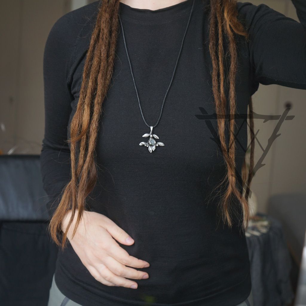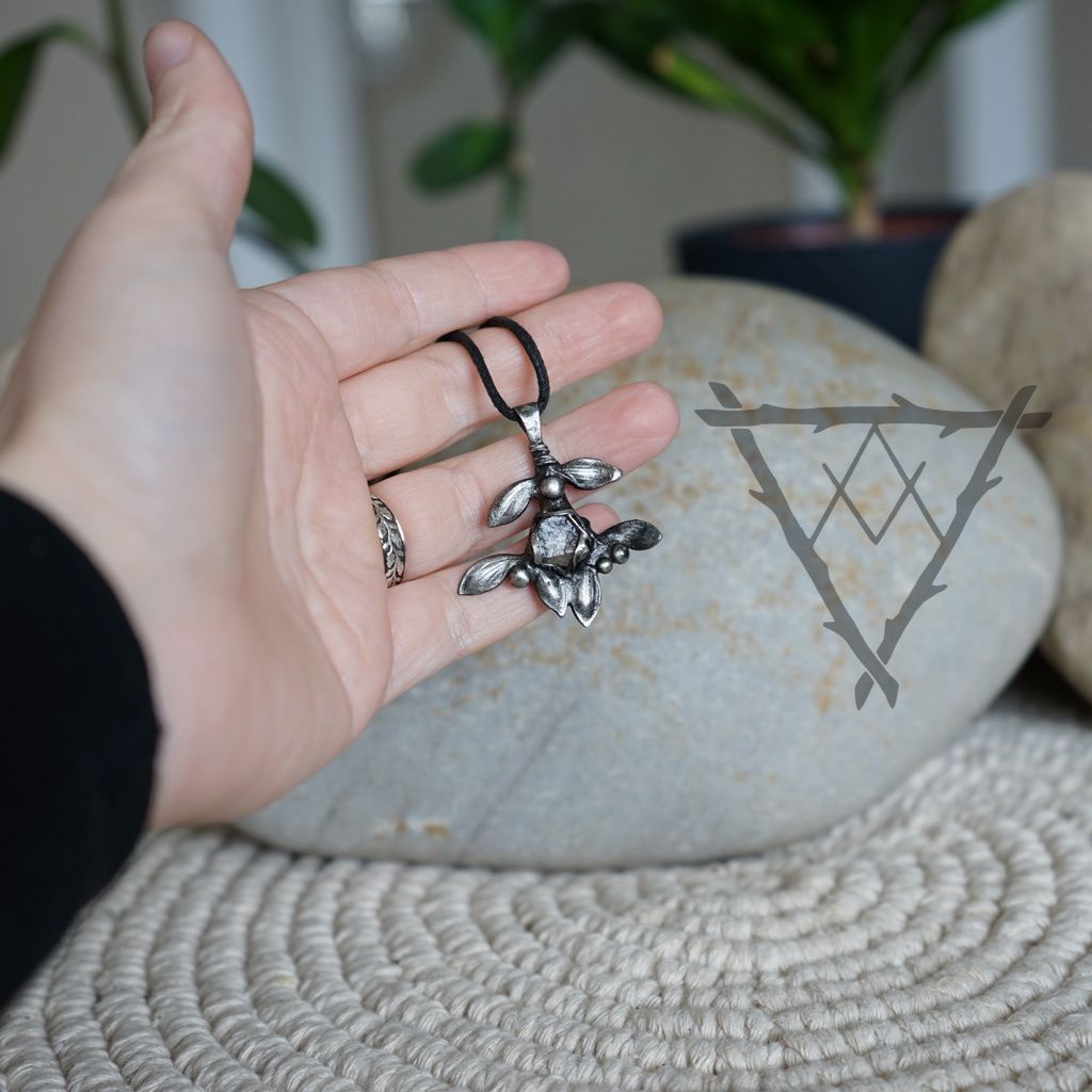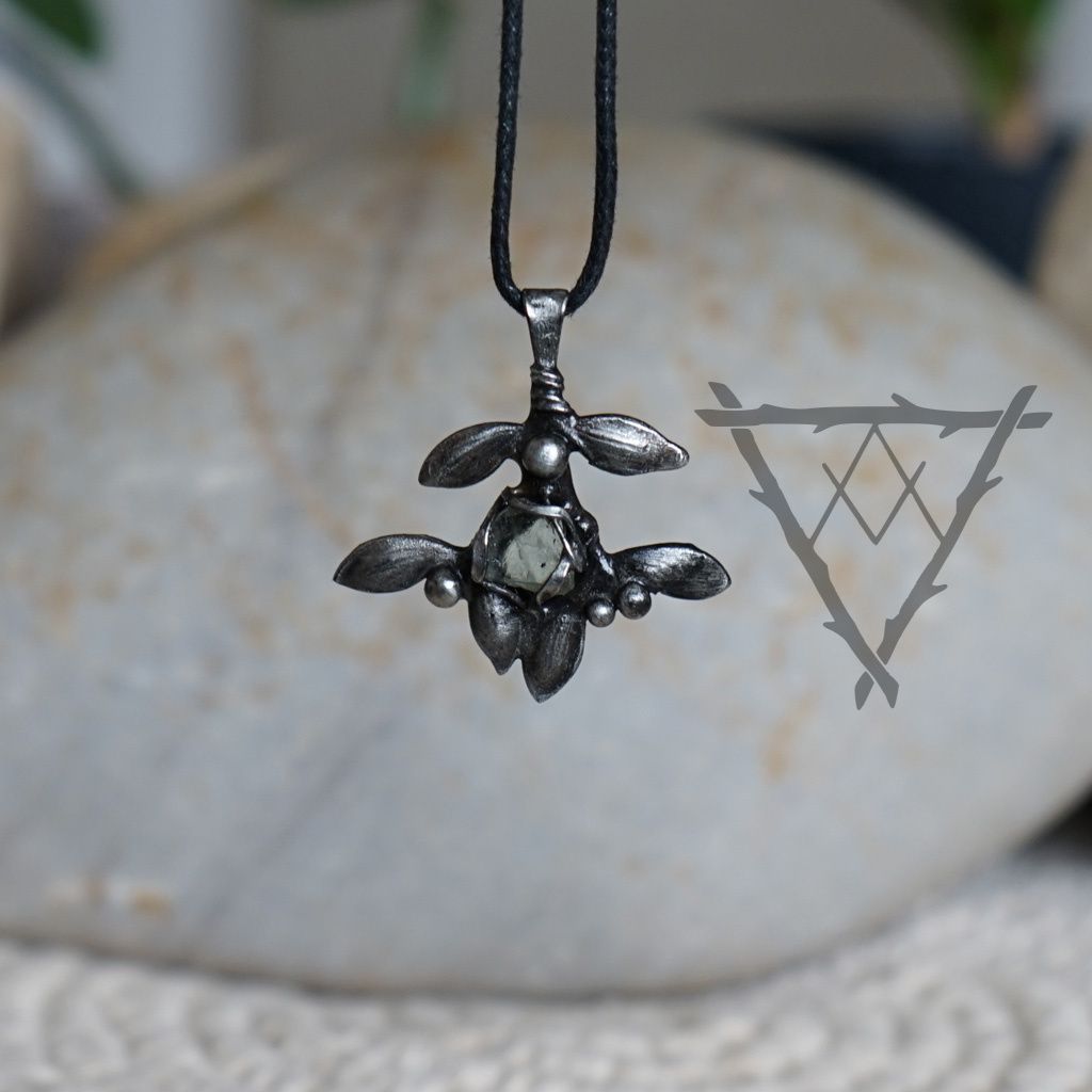 Tento šperk propojuje jemnou magii jmelí s čistou, proměnlivou energií surového fluoritu. Jmelí je od pradávna považováno za posvátnou rostlinu ochrany, života a spojení mezi světy – roste mezi nebem a zemí, bez přímého kontaktu s půdou, a symbolizuje tak rovnováhu, nezávislost a duchovní přesah. Nese v sobě energii klidu, harmonie a tichého požehnání. Surový fluorit přináší jasnost mysli, podporuje soustředění a pomáhá uspořádat myšlenky i emoce. Jeho přirozená, neopracovaná forma zachovává silnou, autentickou energii, která působí očistně a harmonizačně. V jejich spojení vzniká šperk, který propojuje intuici s rozumem – jemně vede, ale zároveň pomáhá vidět věci zřetelně.