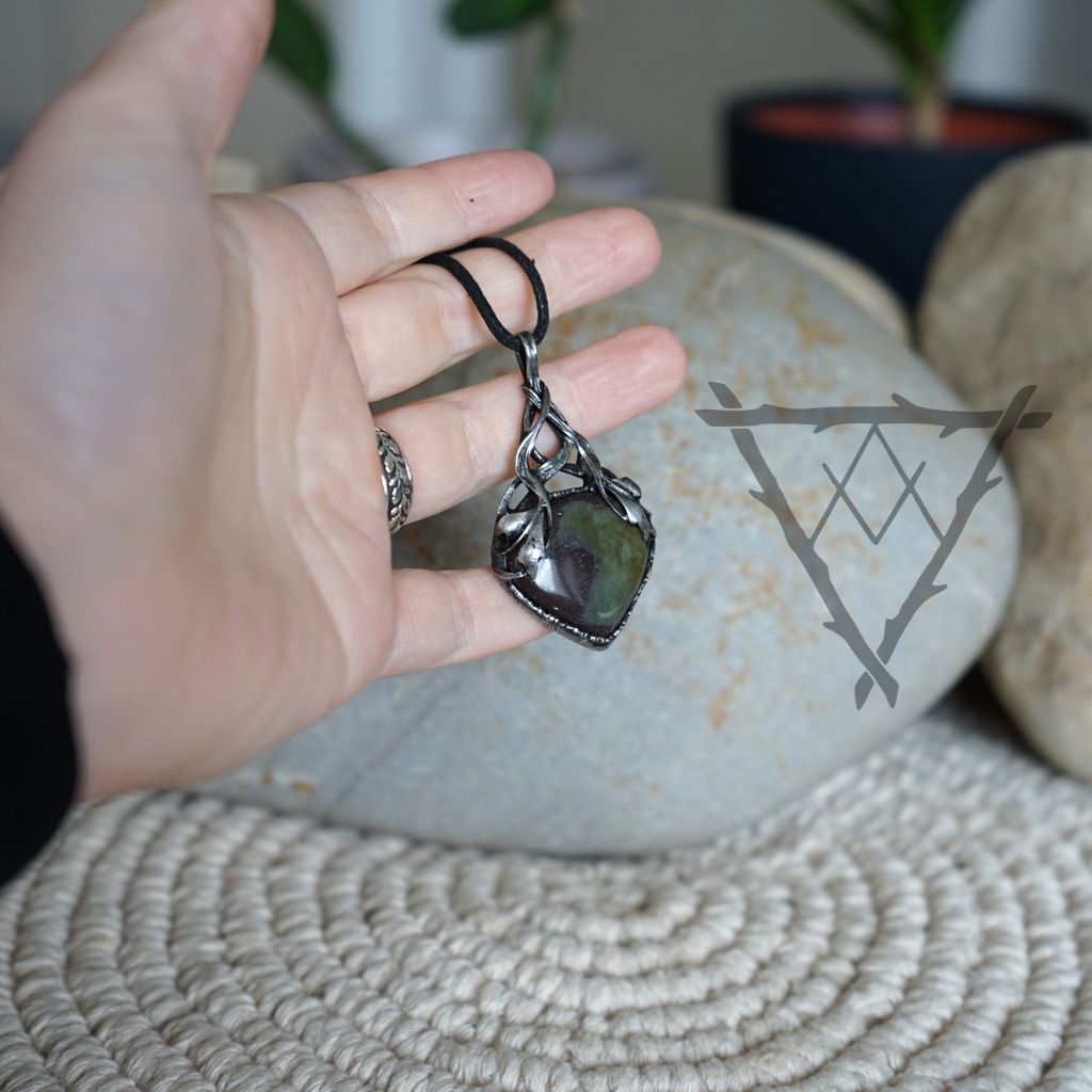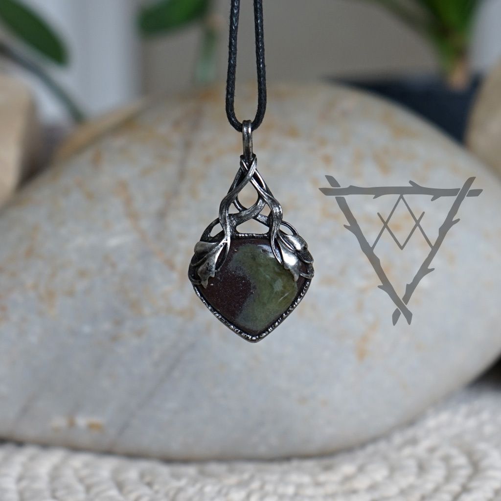 Šperk s Prehnitem. Hnědá část je mateřská hornina, ve které Prehnit narostl a vytvořil se tak velmi krásný efekt.