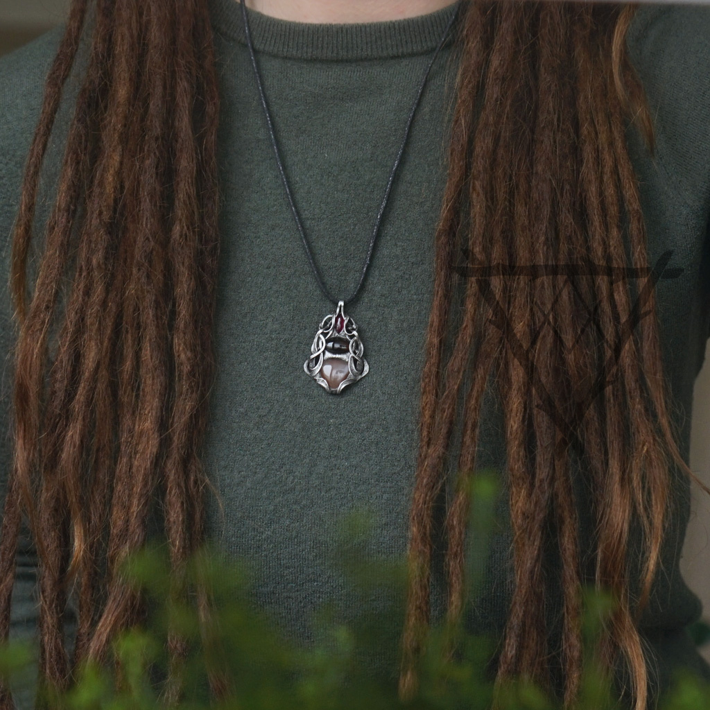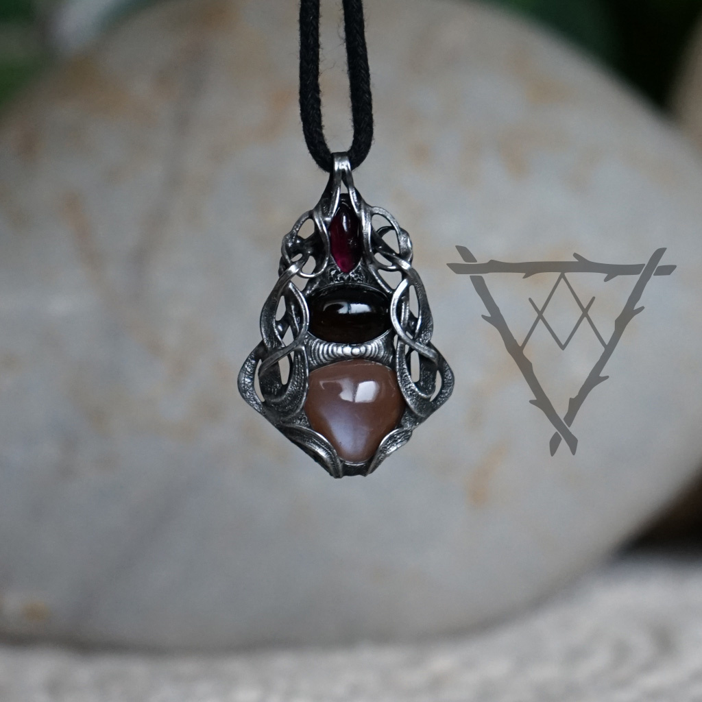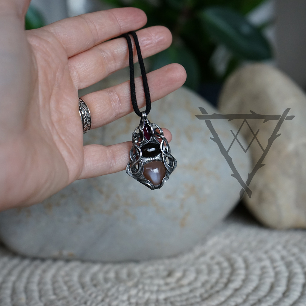 Granát v tomto šperku probouzí životní sílu, odvahu a žár srdce – je to kámen, který posiluje odhodlání a přináší energii do každého kroku. Záhněda jeho vášeň uzemňuje, tiší napětí a pomáhá uvolnit vše, co už neslouží, aby mohla vzniknout vnitřní čistota a klid. Adulár, kámen měsíčního světla, dodává celé kombinaci jemnou intuici, citlivost a ženskou moudrost. Společně vytvářejí rovnováhu mezi silou, stabilitou a intuicí – podporu pro každého, kdo chce jít cestou vědomého a pevného klidu.