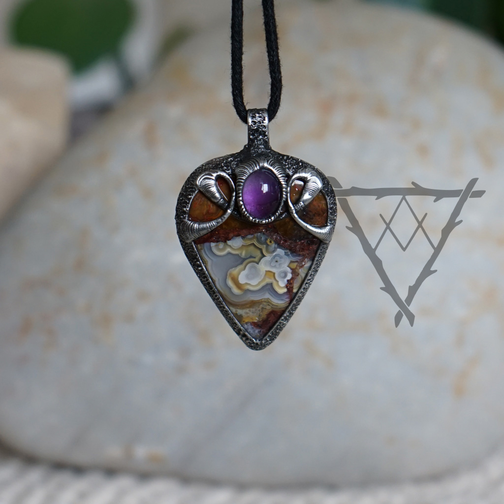 Achát obsahuje v sobě vrostlou řadu malých krystalků Ametystu a proto jsem šperk takto doplnila hlazeným Ametystem ve vrchní části.