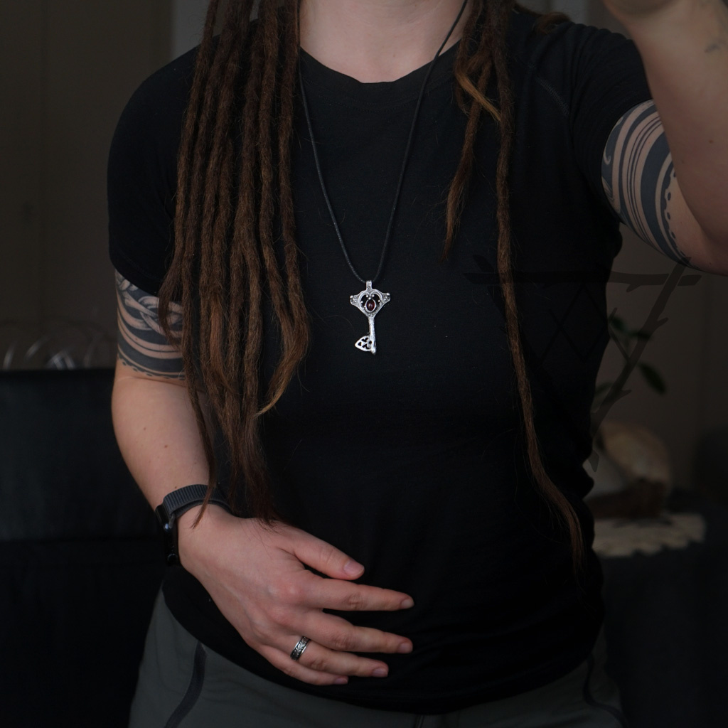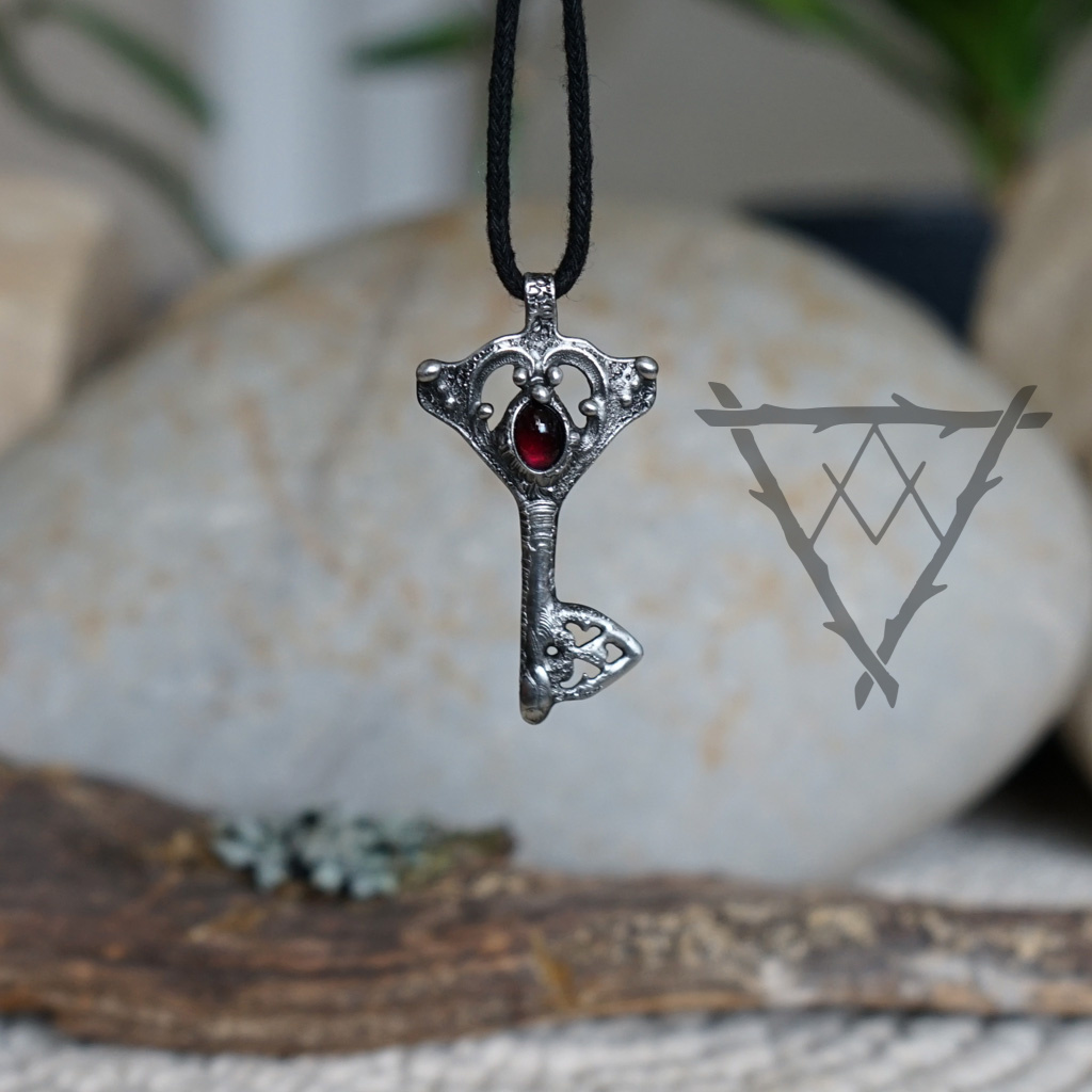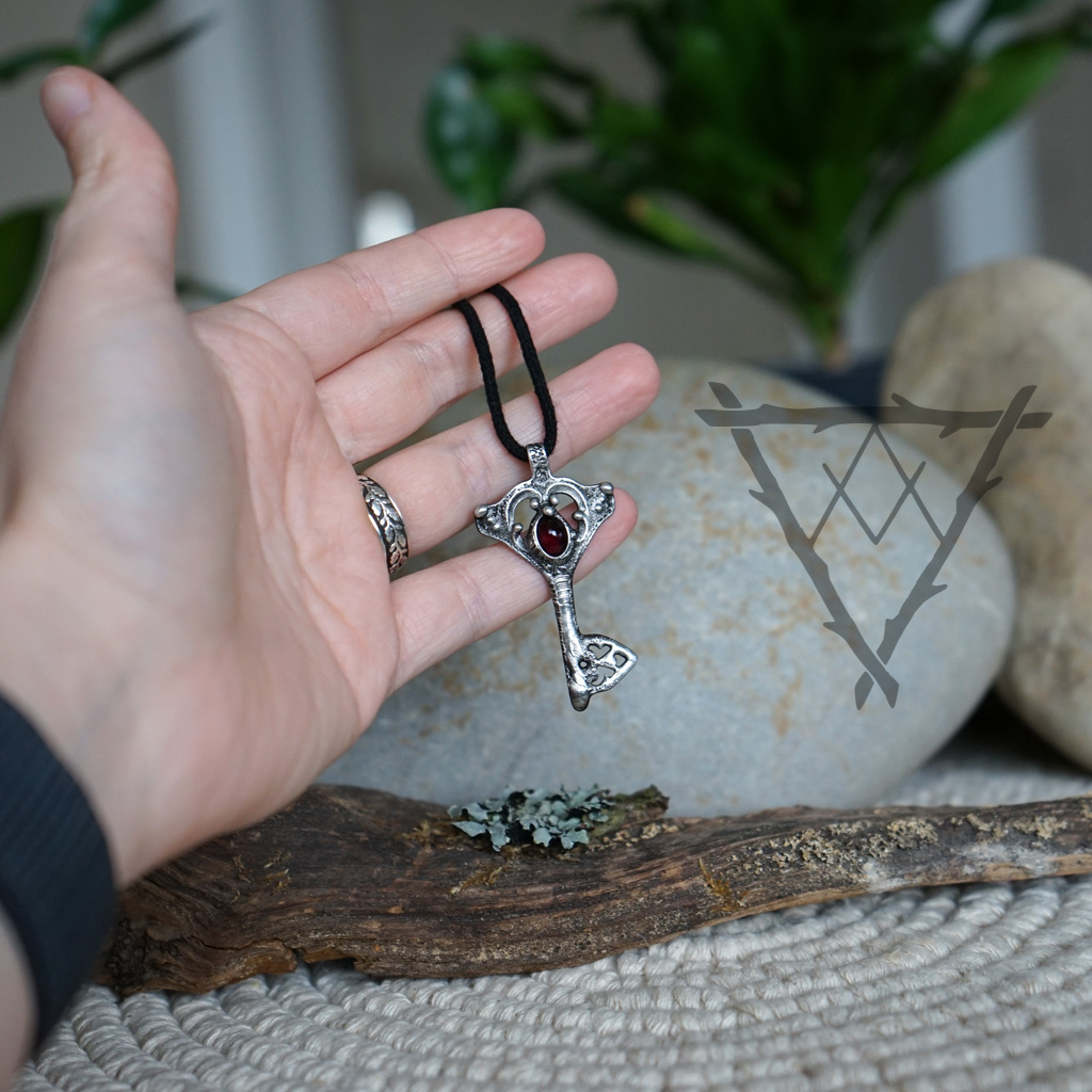 Šperk ve tvaru klíče s granátem v sobě nese sílu odvahy, vášně a životní energie. Klíč zde symbolizuje otevření nových možností a vstup do období, kde je potřeba jednat s rozhodností a důvěrou ve vlastní schopnosti. Granát je kamenem vitality, vnitřního ohně a zakořenění, který podporuje sílu jít vpřed i v náročnějších chvílích. Pomáhá probouzet odvahu, stabilitu a chuť tvořit svůj vlastní směr. Jeho hluboká barva odráží intenzitu života a připomíná, že skutečná síla vychází ze spojení se sebou samým. Společně tak klíč a granát vytváří výrazný celek, který symbolizuje odemykání vnitřní síly a aktivní přístup k vlastní cestě. Tento šperk může být talismanem pro nové začátky, rozhodnutí i období změn. Připomíná, že některé dveře se otevírají odvahou vykročit – a vírou ve vlastní oheň.