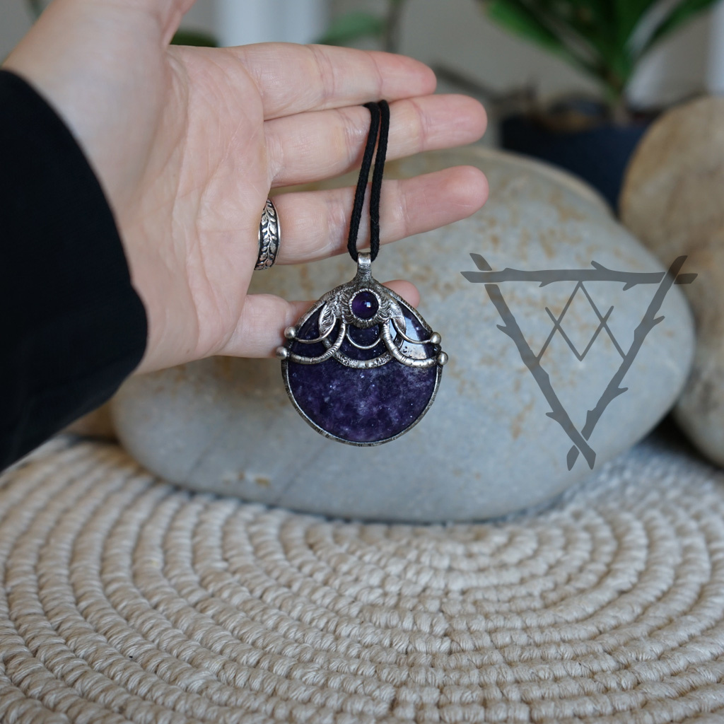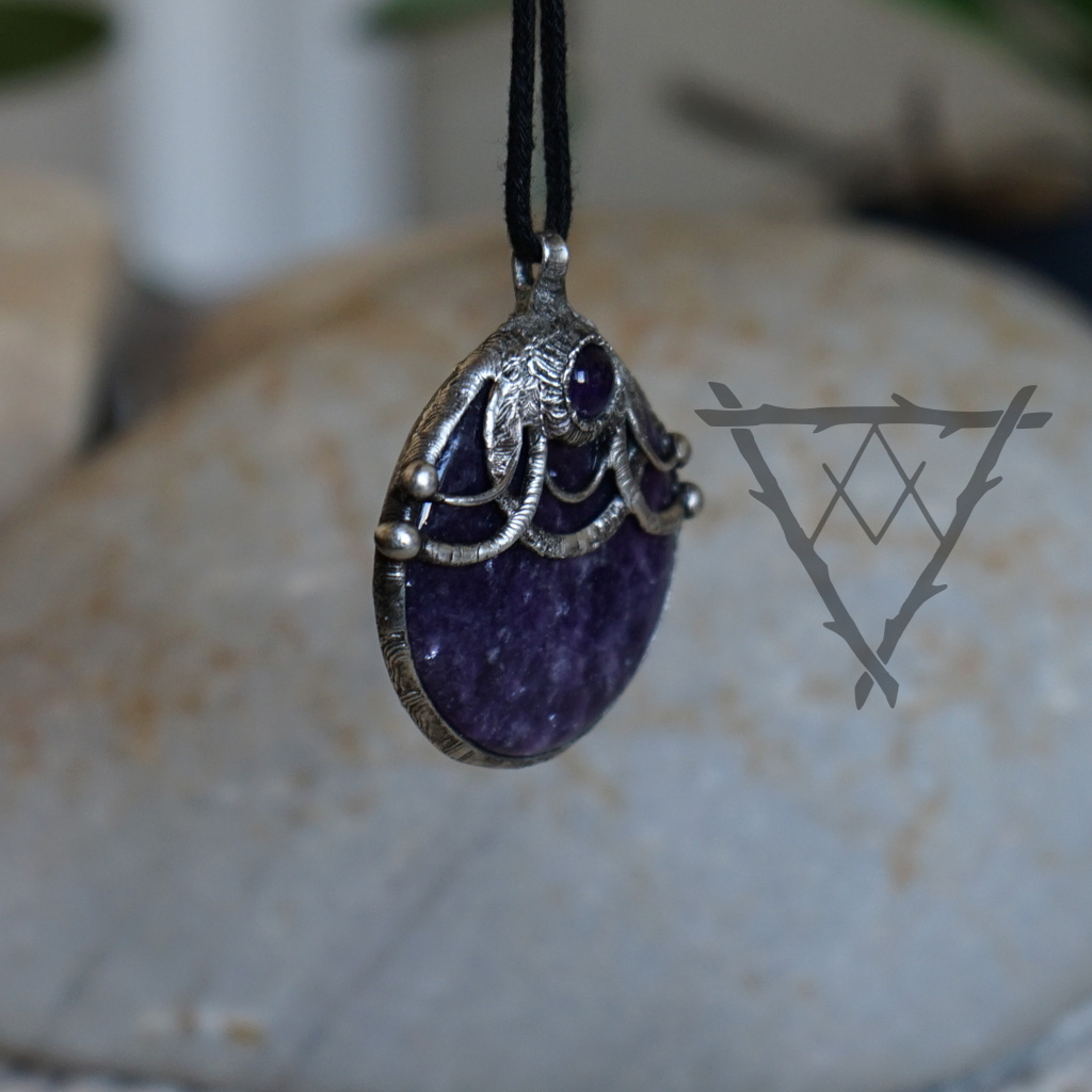 Výrazný šperk s menším Ametystem a Lepidolitem.
