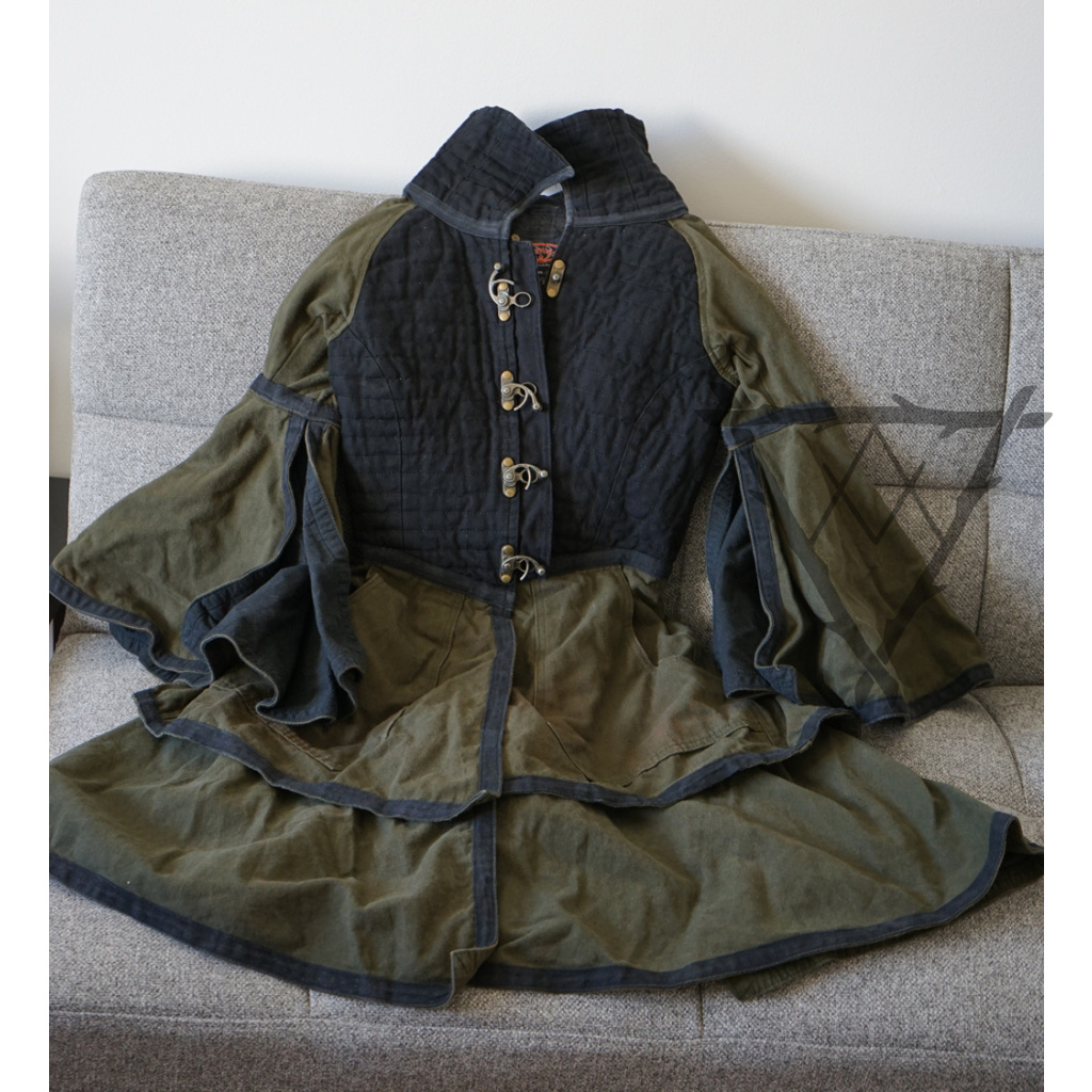 Oblečení semnou zažilo nespočet akcí v Německu při prodeji šperků a tak je to na něm vidět. Látka je onošená, háčky jsou odřené, ale ještě pořád by mohl tento originální kousek udělat někomu radost na historických a fantasy akcích.