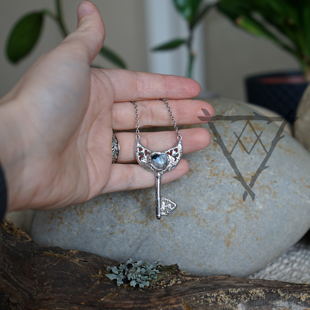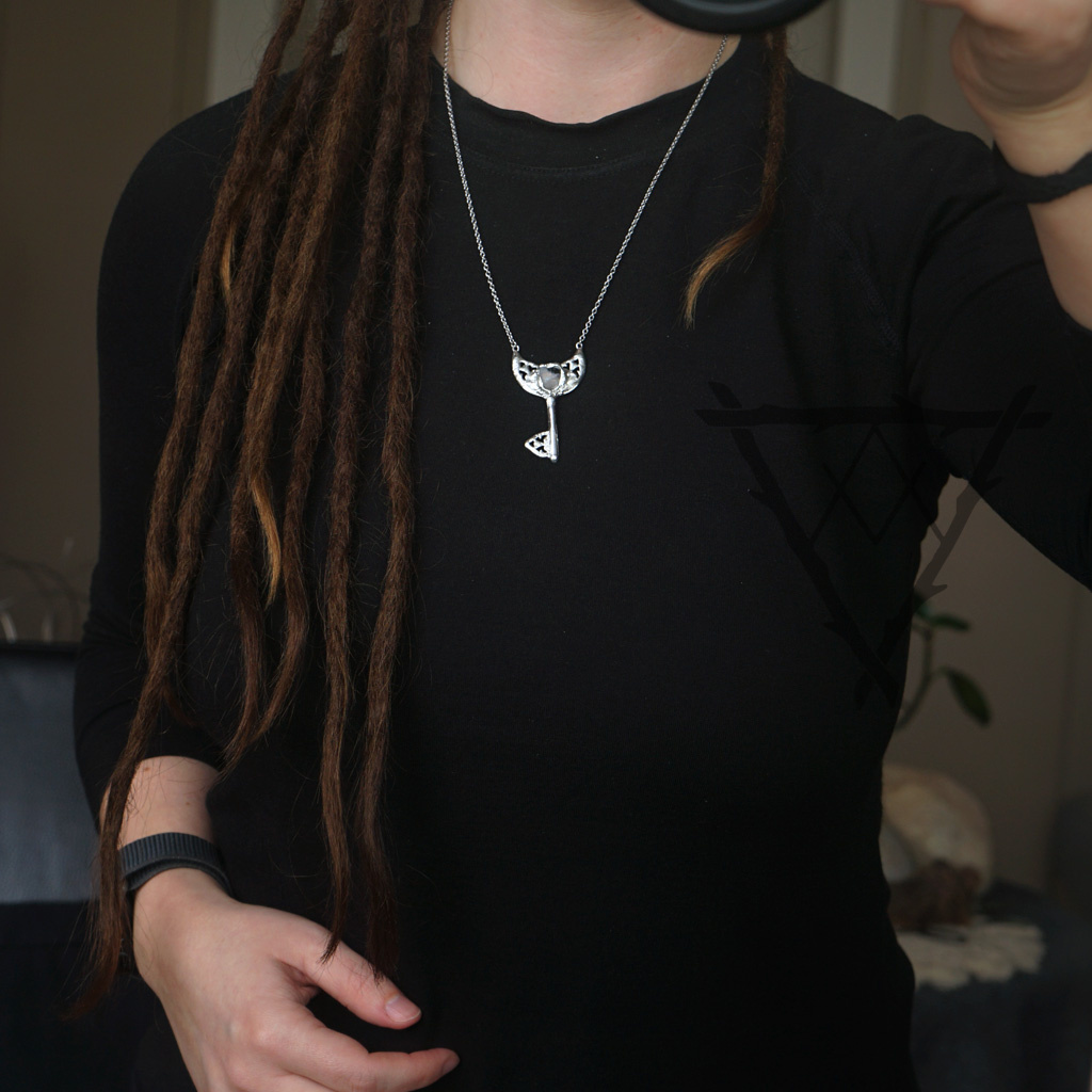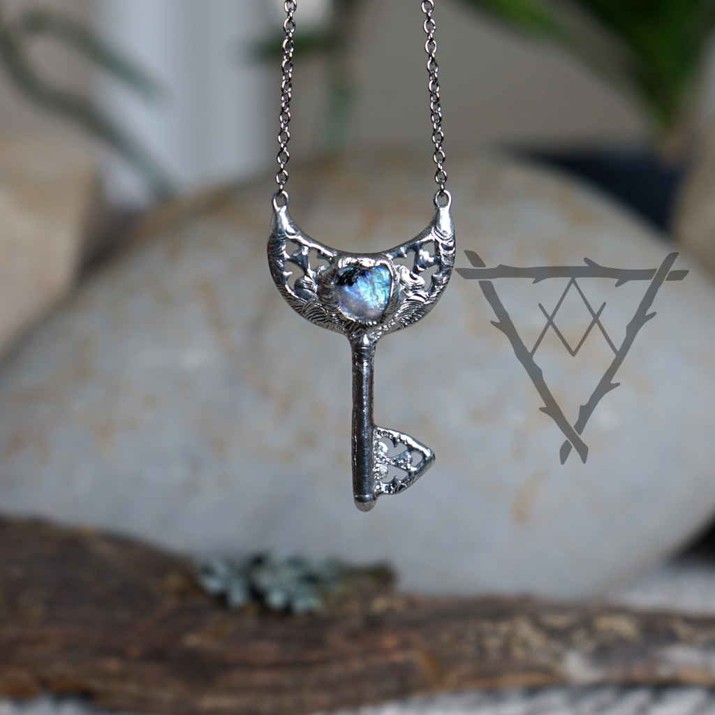 Spojení těchto dvou symbolů vytváří harmonii mezi akcí a vnímáním – klíč otevírá cestu, zatímco měsíční kámen napovídá, kam jít. Šperk tak může sloužit jako osobní talisman pro nové začátky, změny nebo důležitá rozhodnutí.