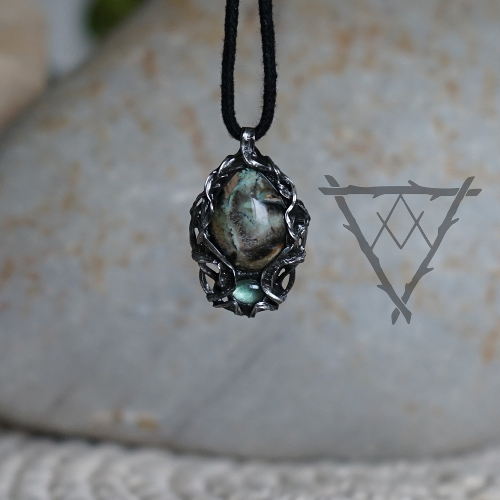 Šperk se zeleným Kyanitem a zkamenělým dřevem.