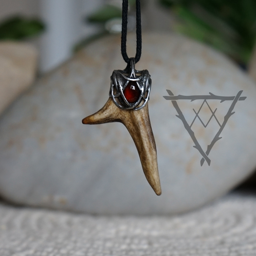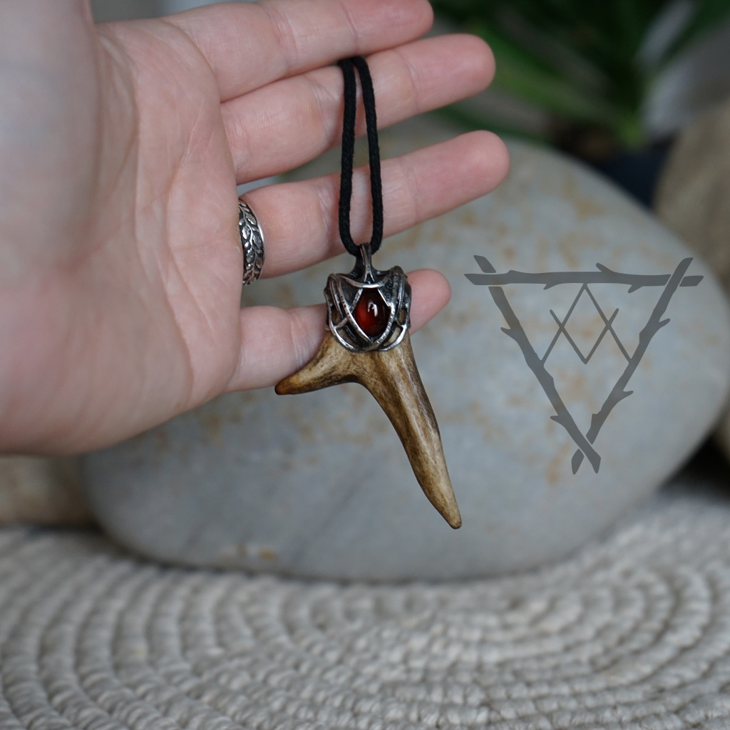 Výrazný šperk se srnčím parůžkem a granátem barvy krve.