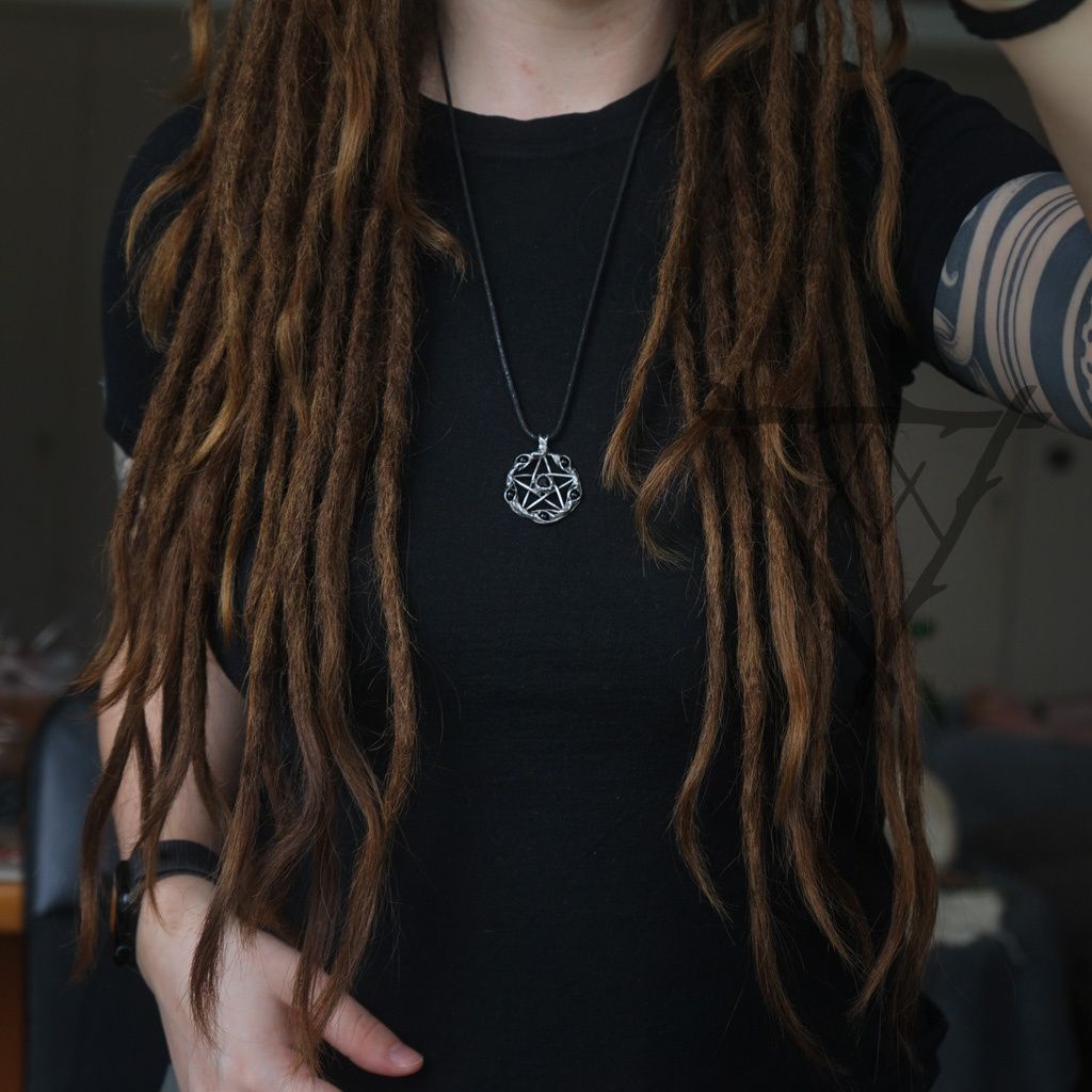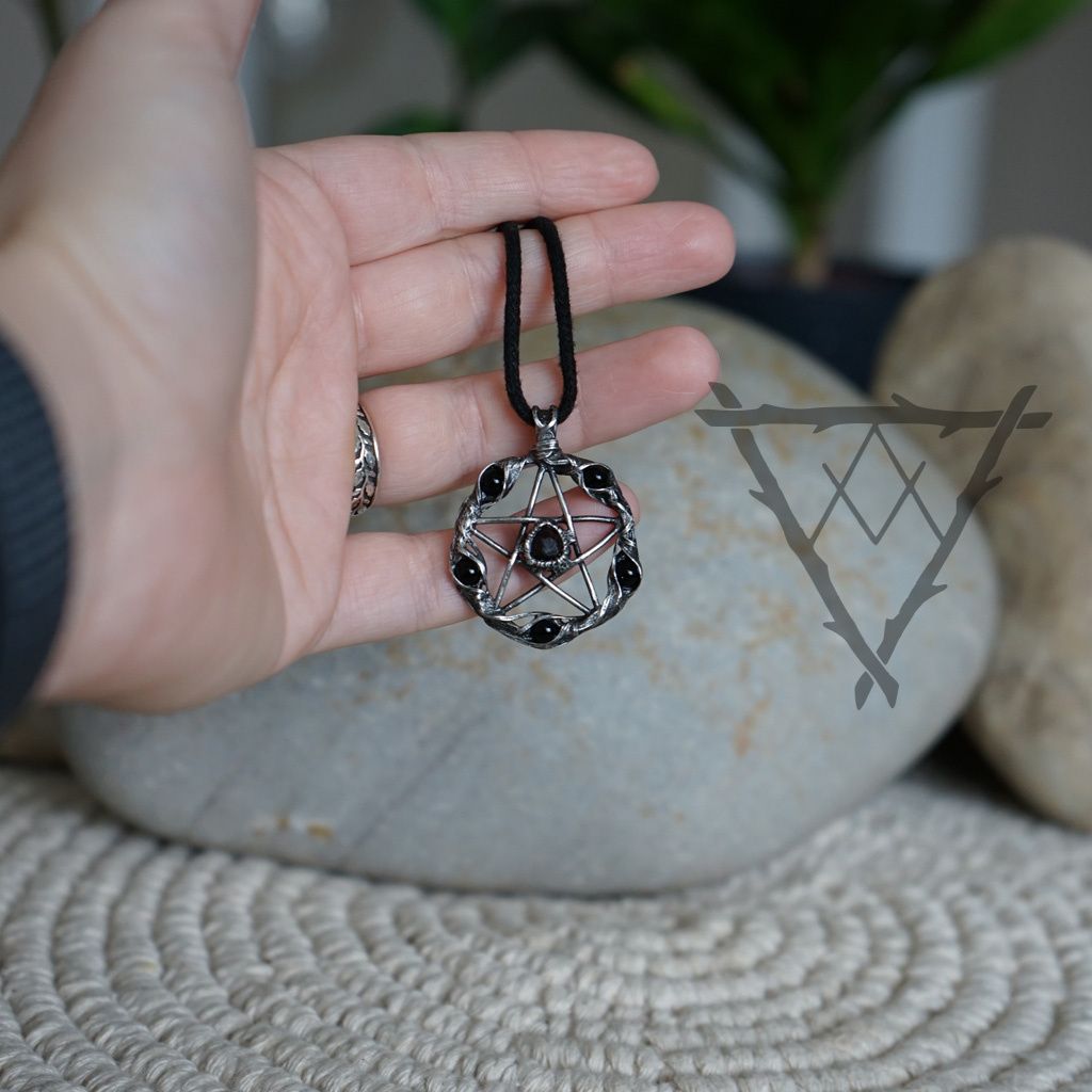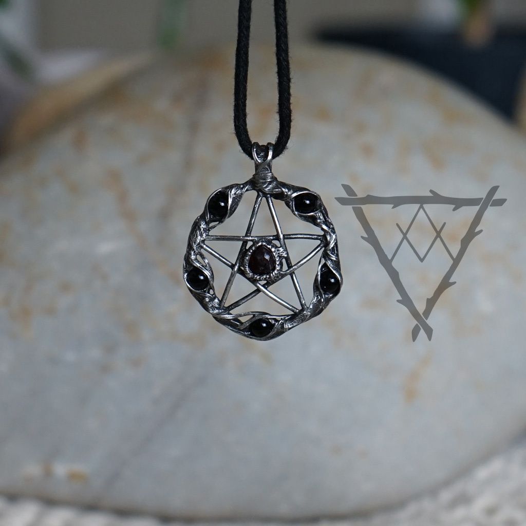 Tento jedinečný šperk je inspirovaný motivem, který v sobě nese sílu tajemství a osobní magie, v mém vlastním autorském pojetí. Dominantou je surový granát zasazený do středu pentagramu – symbolu ochrany, rovnováhy a propojení živlů. Granát je kamenem životní energie, vášně a vnitřní síly, podporuje odvahu jít vlastní cestou a ukotvení v sobě. Okolo něj jsou zasazeny hladké onyxy, které působí jako ochranný kruh, pohlcují negativní energii a přinášejí klid a stabilitu. Společně tyto kameny vytvářejí harmonii mezi silou a ochranou, aktivitou a uzemněním. Pentagram zde symbolizuje propojení těla, mysli a ducha, ale také vědomé uchopení vlastní moci. Šperk tak může sloužit jako osobní talisman pro posílení vnitřní rovnováhy a ochrany v každodenním životě. Je ideální pro ty, kdo hledají nejen estetiku, ale i hlubší význam a energii ve šperku.