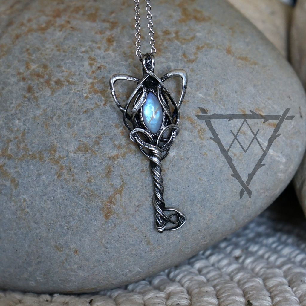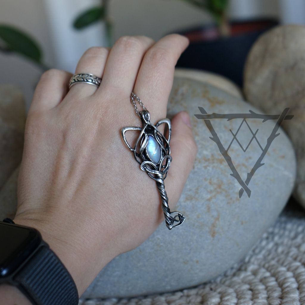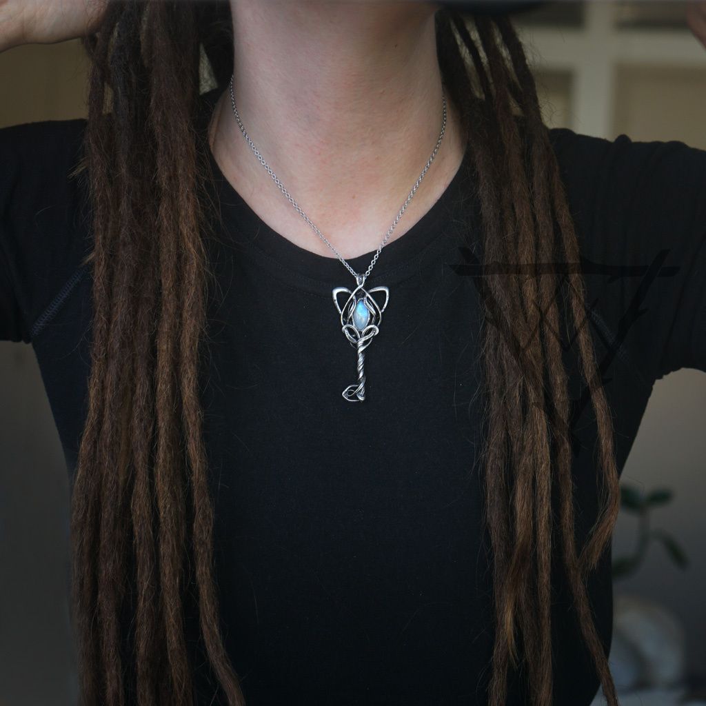 Tento jemný šperk ve tvaru klíče v sobě nese symboliku otevírání nových cest, tajemství i vnitřního poznání. Klíč je od pradávna vnímán jako průvodce k novým možnostem, k odvaze vykročit a objevit to, co bylo dosud skryté. Dominantou šperku je měsíční kámen, jehož duhový lesk nese energii luny. Je spojován s intuicí, ženskou energií a vnitřní harmonií, pomáhá zklidnit mysl a naslouchat vlastním pocitům. Tento kámen bývá také symbolem nových začátků a proměn, které přicházejí přirozeně a bez tlaku. Z geologického hlediska patří měsíční kámen do skupiny živců a jeho typický třpyt, nazývaný adularescence, vzniká lomem světla na jemné vnitřní vrstvené struktuře minerálu. Každý kámen je jedinečný, s vlastní kresbou i intenzitou odlesků, a nese tak neopakovatelný charakter přírody. Šperk jako celek propojuje sílu symbolu klíče s jemnou energií měsíčního kamene a vytváří osobní talisman pro chvíle změn i hledání vlastního směru.