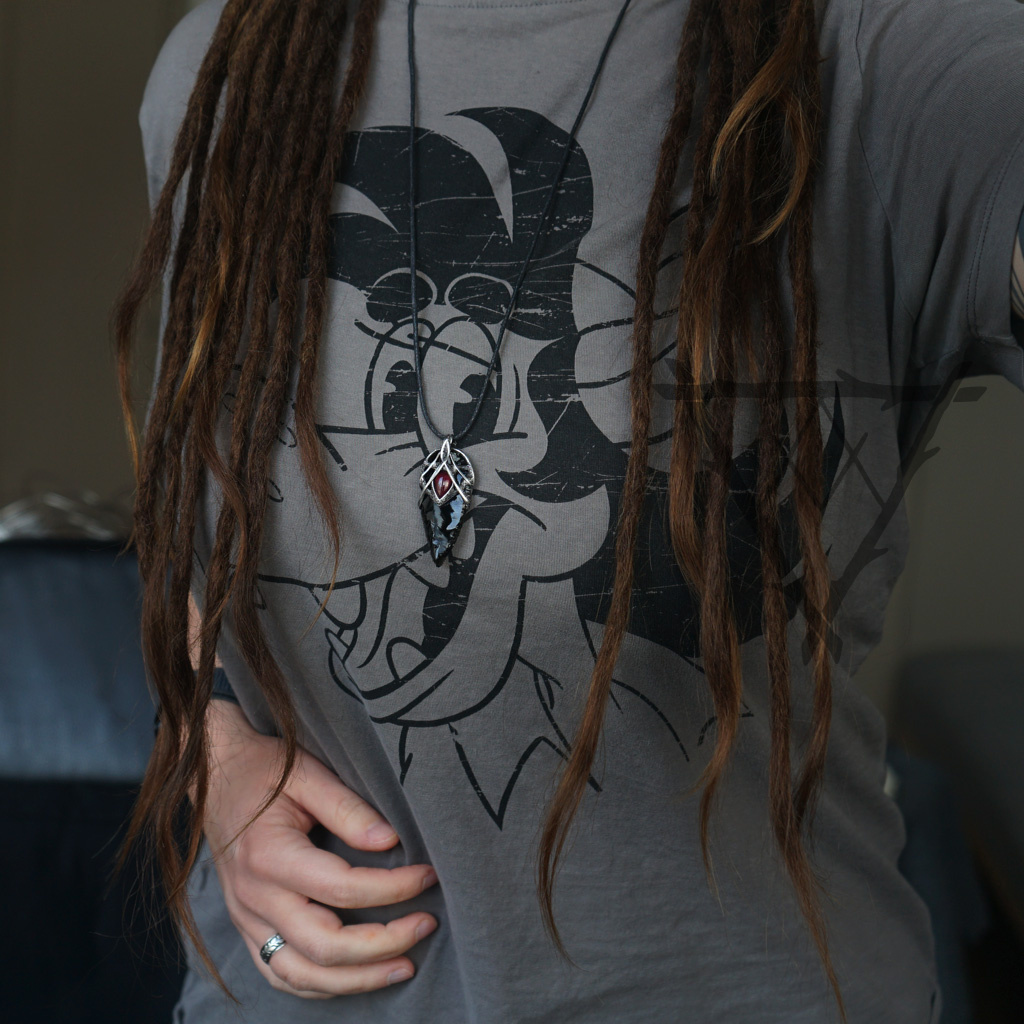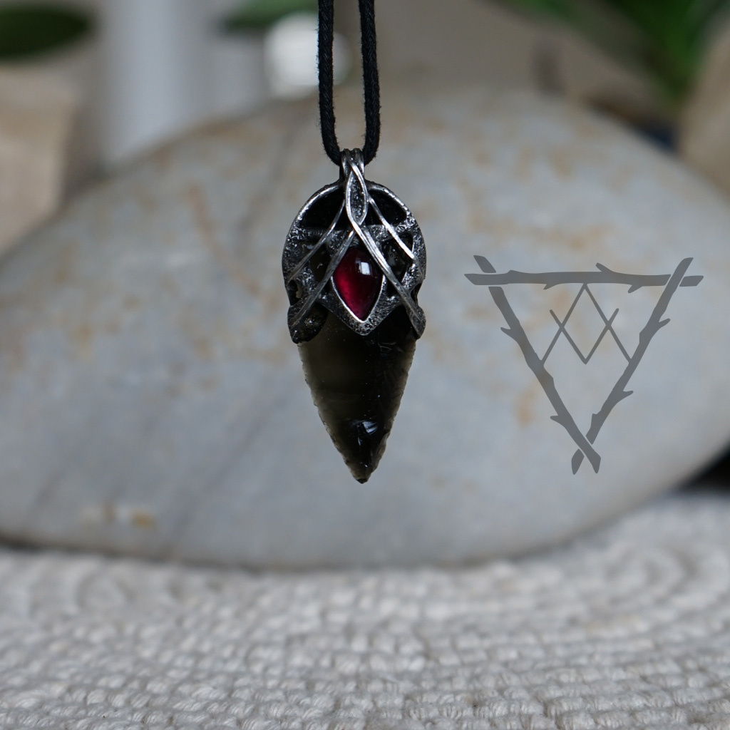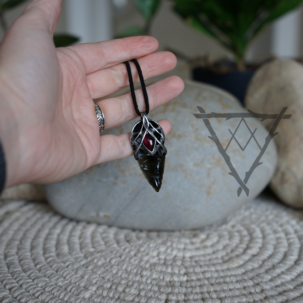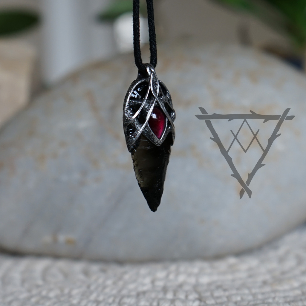 Tento šperk spojuje sílu granátu a hlubokou ochranu obsidiánu v jedinečném harmonickém celku. Granát září energií vášně a vitality, posiluje životní sílu a motivaci, přináší odvahu čelit novým výzvám. Naopak obsidián, kámen noci a ochrany, chrání před negativními vlivy a pomáhá uvolnit staré emoční bloky. Společně tvoří dokonalou rovnováhu mezi aktivní životní energií a klidnou, ztišující silou. Tento šperk působí jako temný talisman královny, který provází nositele po cestě mezi světlem a stínem.