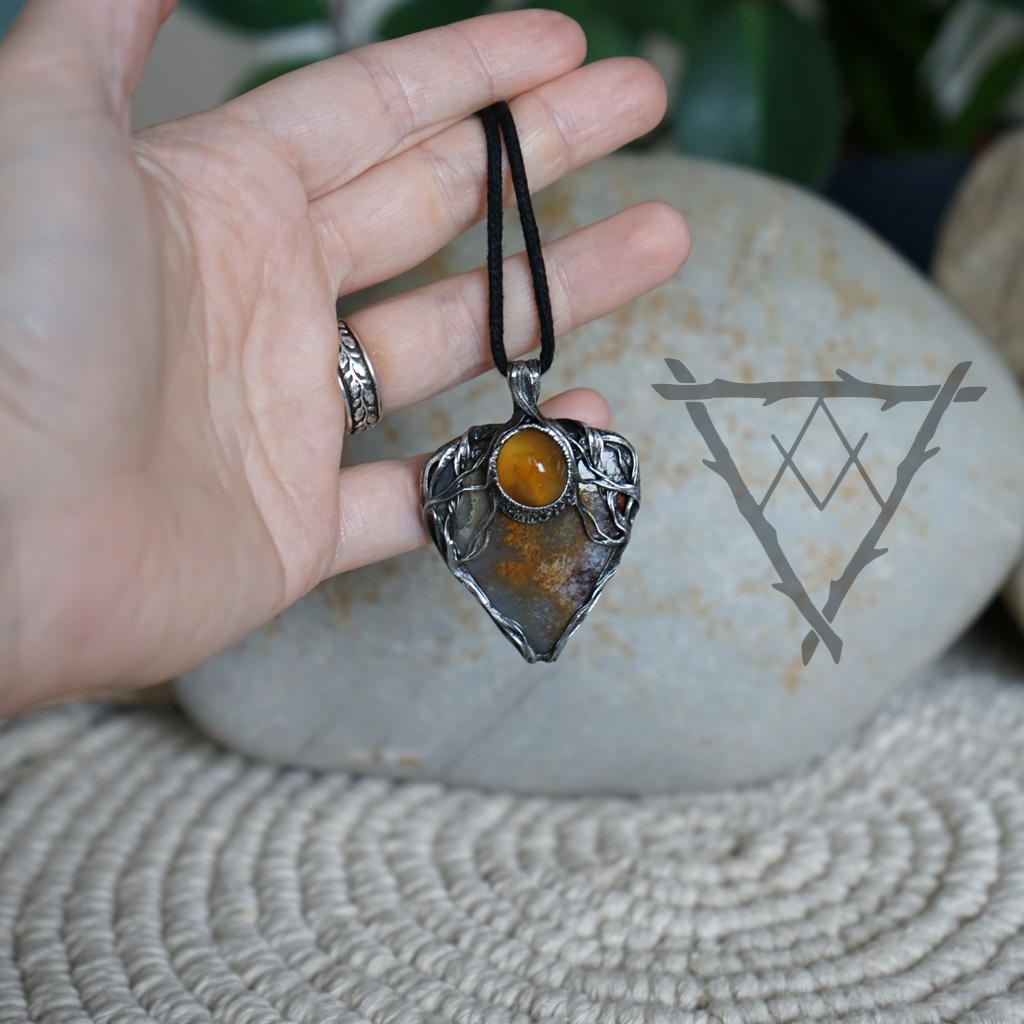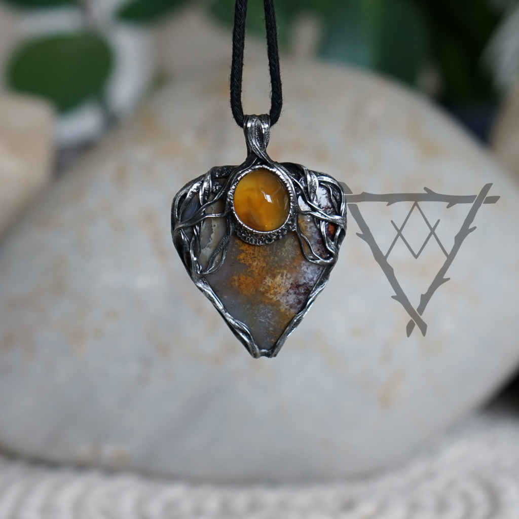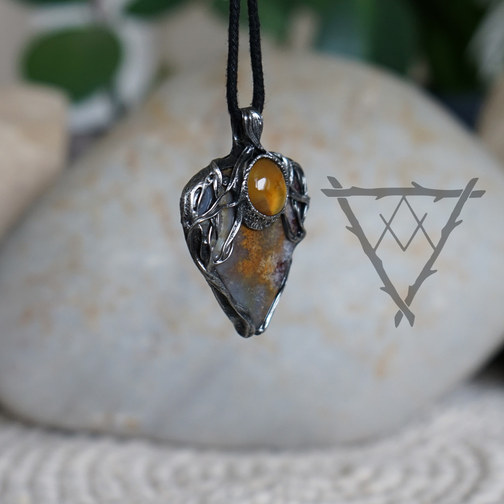 Tento přívěsek propojuje dvě energie, které se krásně doplňují — žlutý Akvamarín a krajkový Achát.