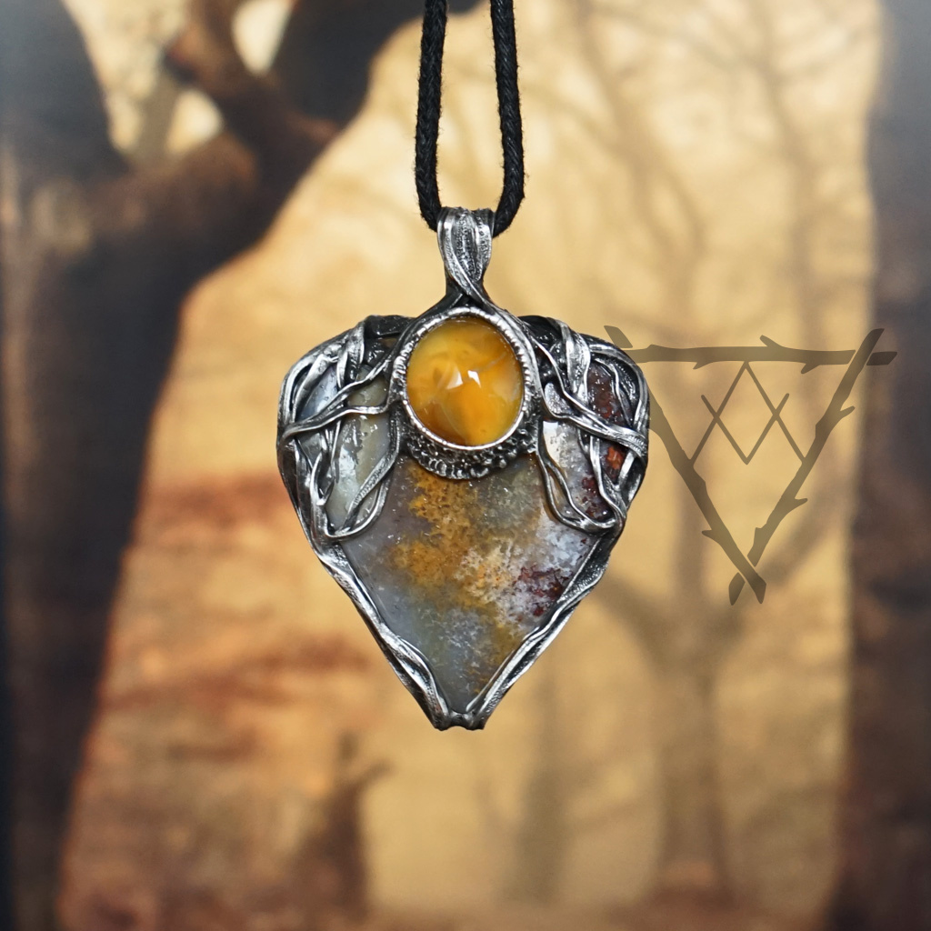 V cínovo-ocelovém zasazení dostávají oba kameny charakter šperku, který působí jako talisman světla a podzimního klidu.