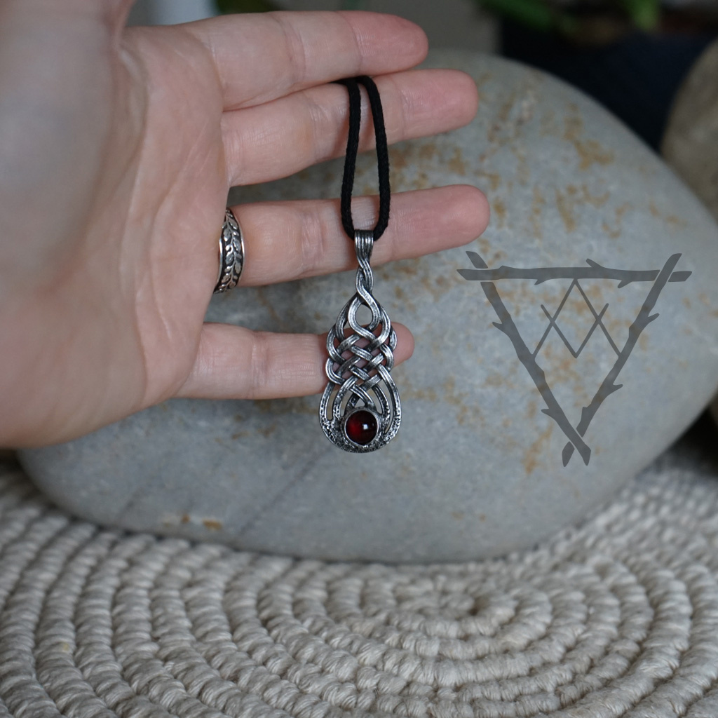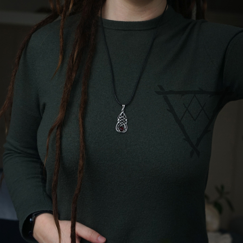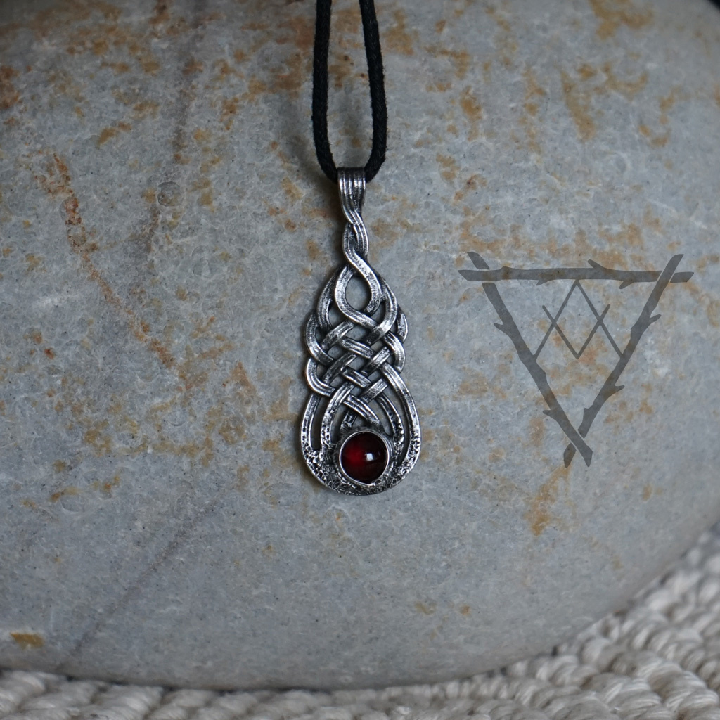 Šperk s granátem a ručně vytvořeným proplétáním.