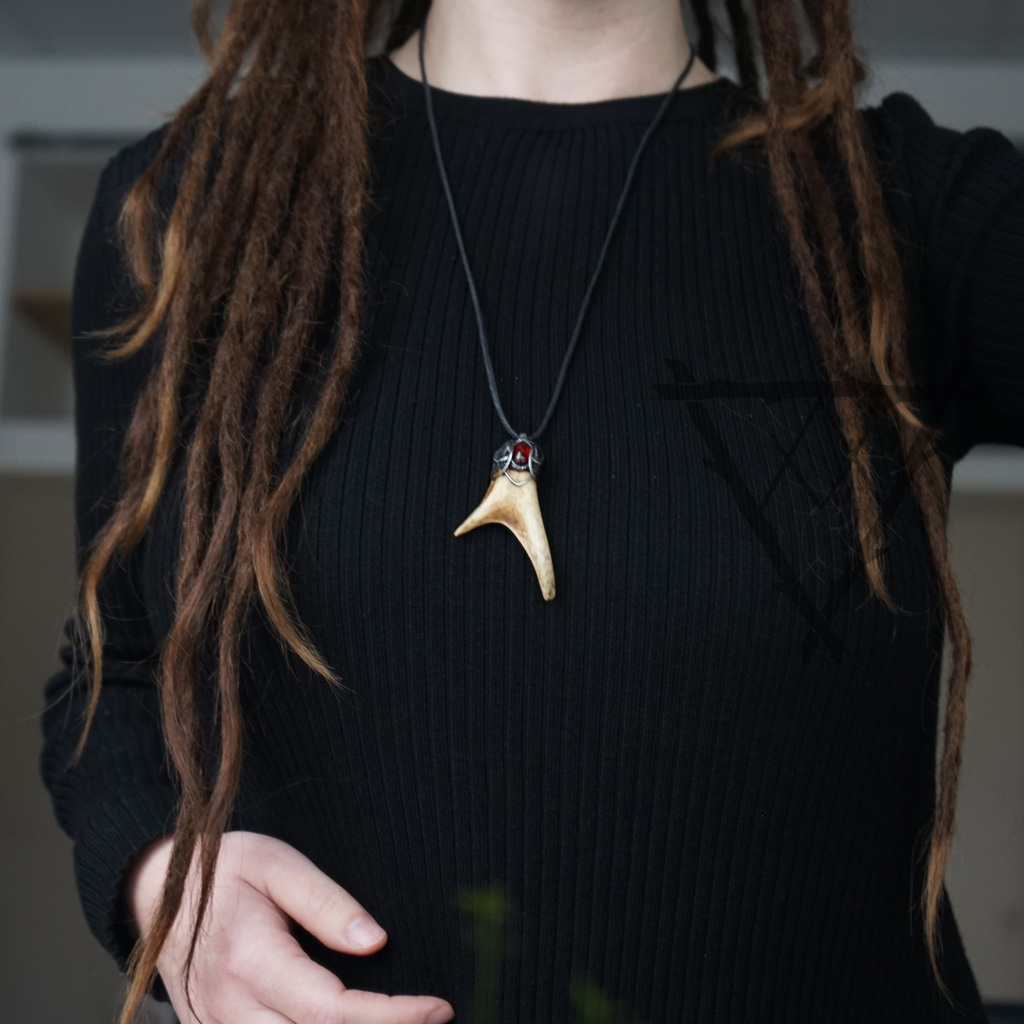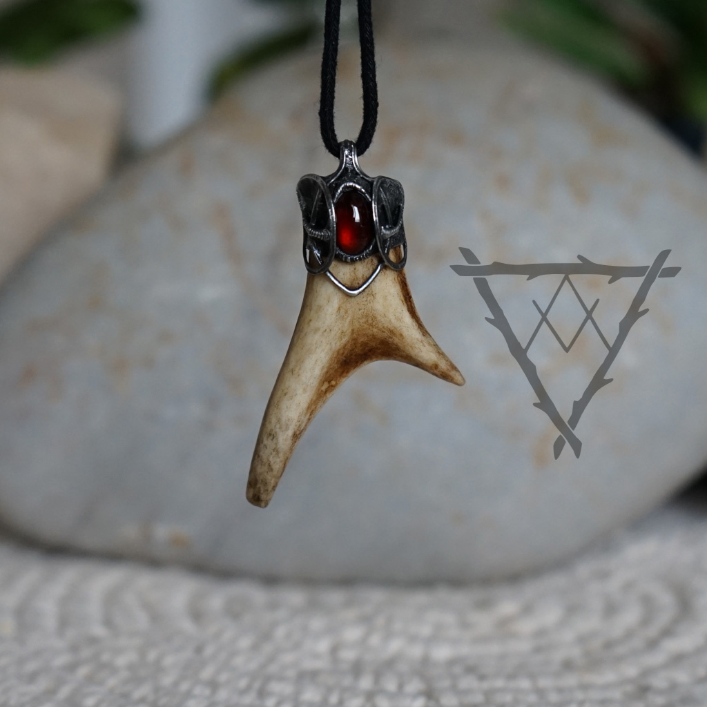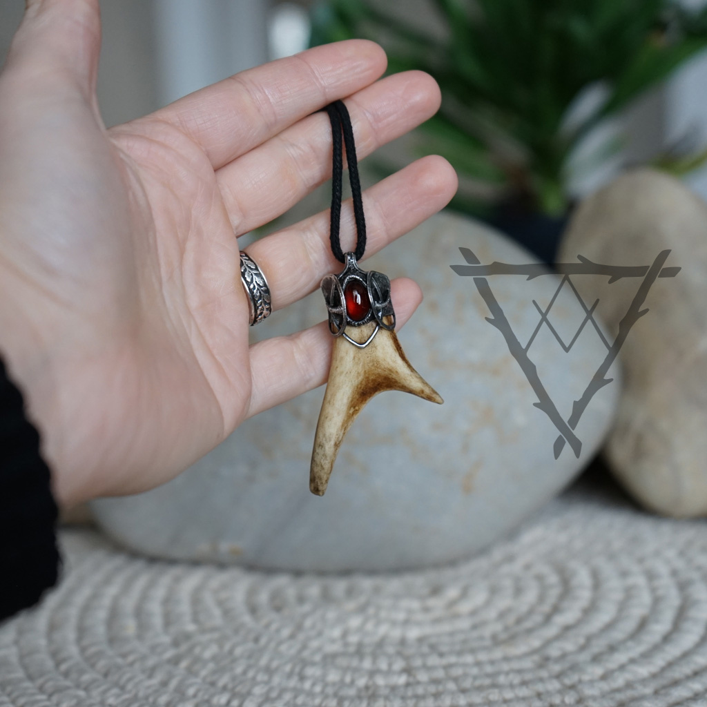 Srnčí parůžek je symbolem přírodní síly, instinktu a tichého přežití v rytmu lesa. Nese v sobě energii zvířete, které je citlivé, ale zároveň neustále ve střehu a v pohybu. V ezoterickém pojetí parůžek představuje spojení s přírodou, cyklem obnovy a zakořeněním v těle. Granát barvy krve tuto energii posiluje – je kamenem vitality, pudové síly a hlubokého propojení se životem. Jeho temně červená barva evokuje krev jako nositelku života a paměti. Spojení granátu se srnčím parůžkem vytváří amulet ochrany, odvahy a přirozené síly bez agrese. Tento šperk podporuje autenticitu a schopnost naslouchat vlastním instinktům. Je určen pro ty, kdo cítí blízkost k lesu, zvířatům a syrové, nezkrocené energii přírody.