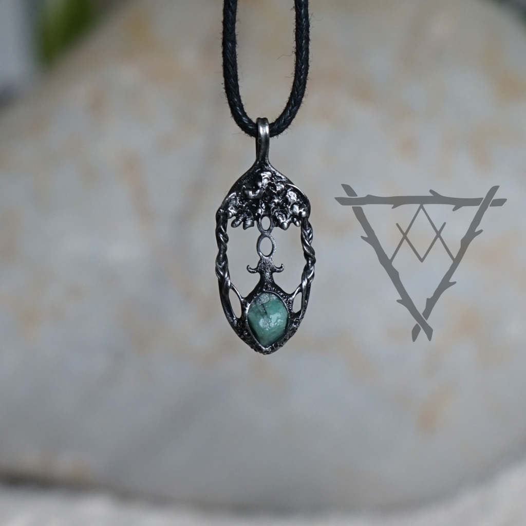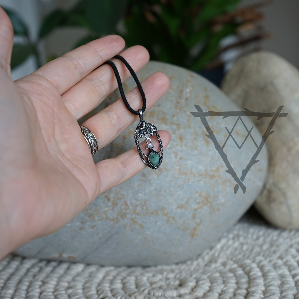 Drobný přívěsek stromu života se surovým Smaragdem.