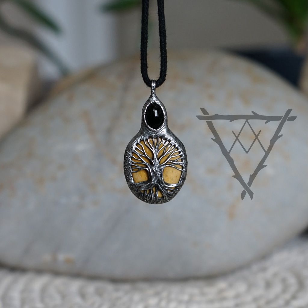 Tento šperk v sobě propojuje hlubokou symboliku severského světa skrze motiv Yggdrasilu – posvátného stromu života, který spojuje nebe, zemi i podsvětí. Jeho větve i kořeny připomínají propojení všech rovin existence a neustálý koloběh proměny, růstu a návratu k sobě. Záhněda, s kouřovým závojem, vnáší do šperku uzemnění, klid a schopnost přijmout i těžší životní etapy bez odporu. Je kamenem vnitřní stability, který pomáhá rozpouštět strach a ukotvuje mysl v přítomném okamžiku. Jaspis dodává sílu, odvahu a vytrvalost – je tichým ochráncem na cestě, který podporuje rozhodnost a pevné kroky vpřed. Jeho energie je zemská, hřejivá a stabilní, jako pevná půda pod nohama v nehostinné krajině severu. Společně tyto prvky vytvářejí harmonický celek, který spojuje duchovní hloubku s praktickou silou a odolností.